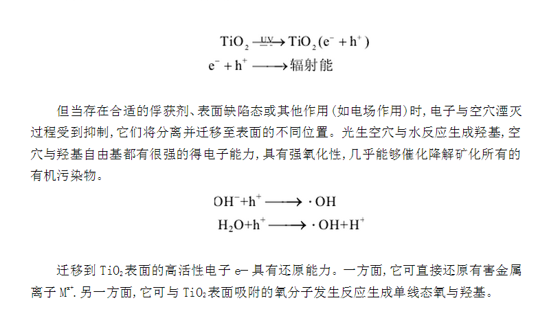 近年來,利用寬禁帶n型半導體制備染料敏化太陽能電池和光催化降解有機物的**氧化技術引起了人們的極大關注,并將此技術應用于COD測定中,目前研究較多的有納米ZnO,SnO2和TiO2材料[4]。和前兩者相比,TiO2來源豐富、價格低廉、耐酸堿腐蝕、耐光蝕、化學穩定性好,是一種具有良好應用前景的光催化劑。當受到能量大于帶隙寬度的紫外光照時,TiO2價帶上的電子受激發躍遷到導帶,在半導體的導帶和禁帶上分別形成光生電子與空穴對(e−,h+).被激活的電子和空穴可能在TiO2顆粒內部或表面重新相遇而發生湮滅,將能量通過輻射散發。