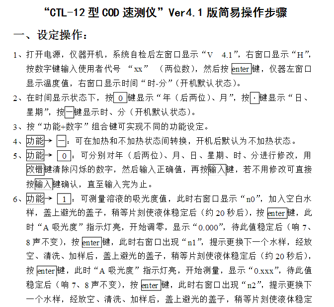 COD快速測定儀(TL-1A) 1.2.2 分光光度計(721) 1.2.3 水浴塑料盆 1.2.4 14ml專用刻度試管及試管架(若干) 1.2.5 1.00ml專用刻度吸管(2只) 1.2.6 5.00ml專用刻度吸管(2只) 1.2.7 吸耳球 1.3 試劑 1.3.1 專用氧化劑 1.3.2 專用催化劑 1.3.3 氯掩蔽劑:稱取20g硫酸汞溶于1:10稀硫酸中,定容**100ml,